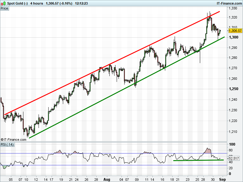 Gold remains above $1300 and within its 2-month rising channel. RSI holding above neutral.