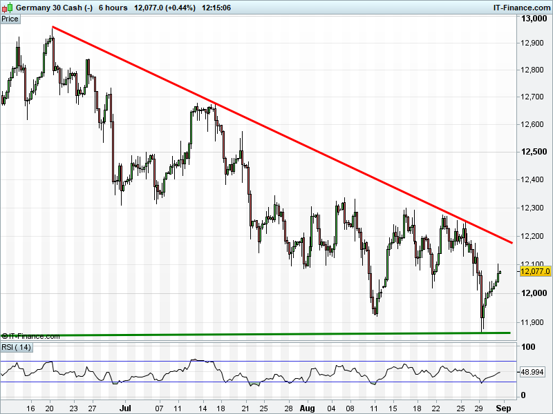 The DAX 30 has bounced back to test 12100, but remains in a June downtrend.