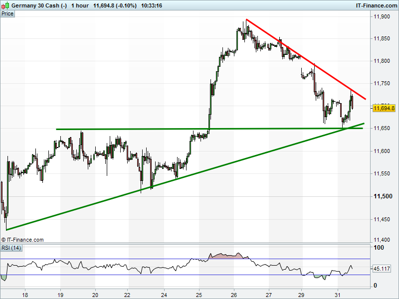 The DAX 30 has had its bounce checked by falling highs resistance at 11735. Which way will it break from this narrowing pattern? Will rising support prevail?