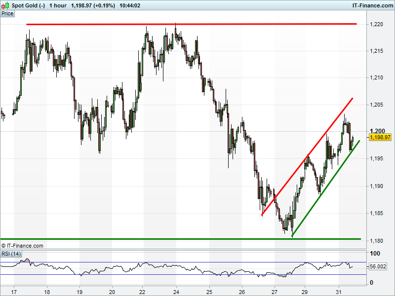 Gold has paused around $1200 after completing a bullish flag from $1180, but uptrend and rising channel still valid.