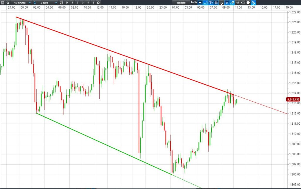 Gold is struggling at its $1314 channel ceiling.