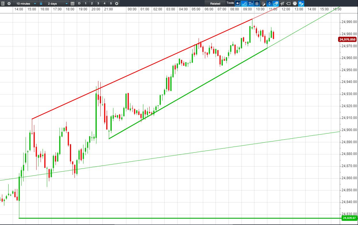 Dow Jones Futures are continuing in their sharp rising channel, knocking on the door of 25k.