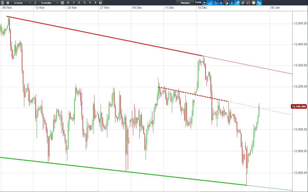 The DAX 30 is extending its bounce from the floor of its November falling channel, testing 13100 intersecting resistance.