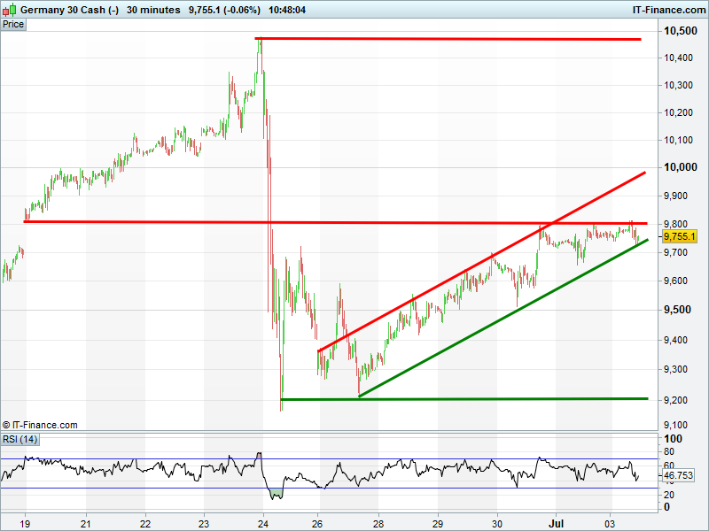 The DAX30 is testing a rising channel for support at 9730. Does the uptrend have legs? Is a Breakout possible like we saw on the UK Index ?