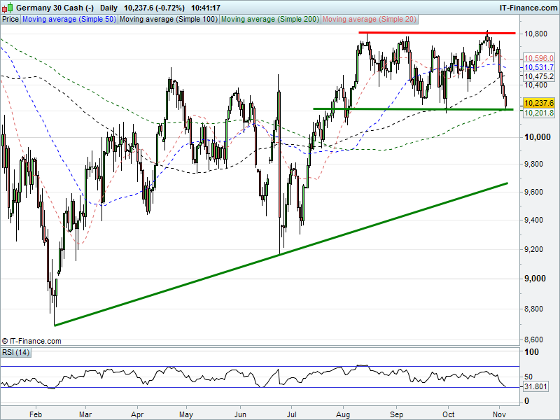 The DAX 30 has found support just above its 10200 200-day moving average and late September lows of 10190. Bounce to 10800? Or bearish double-top breakdown to 9600?