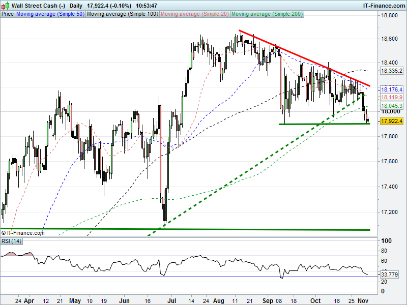 Dow Jones Futures declines may have slowed but they continue to flirt with September 17900 lows. Bullish bounce to 18200 or bearish triangle breakdown to 17100?