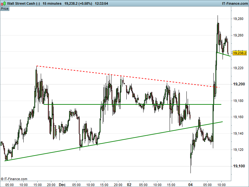 Dow Jones Futures have broken out of last week’s narrowing pattern to once more post fresh all-time highs. Bullish flag pattern?