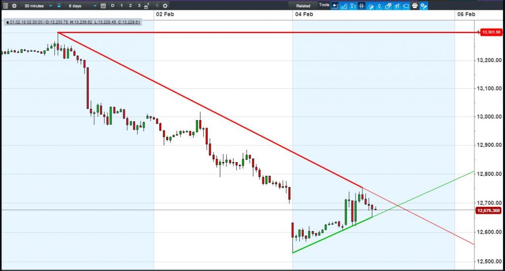The DAX 30 is nearing the apex of a narrowing pattern at 12700. Not the downtrend weighs more heavily than the uptrend, potentially representing more resistance.