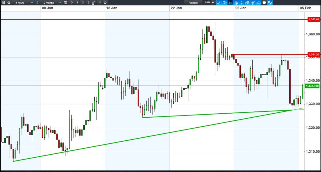 Gold’s has bounced off $1330 thanks to a USD off its highs and safe-haven demand while equities remain under pressure.