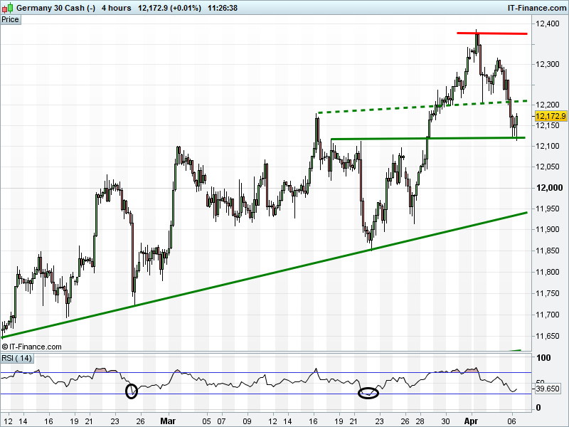 The DAX 30 has broken below 12200, but found support at 12120. Note, however, the RSI did not fall to oversold.