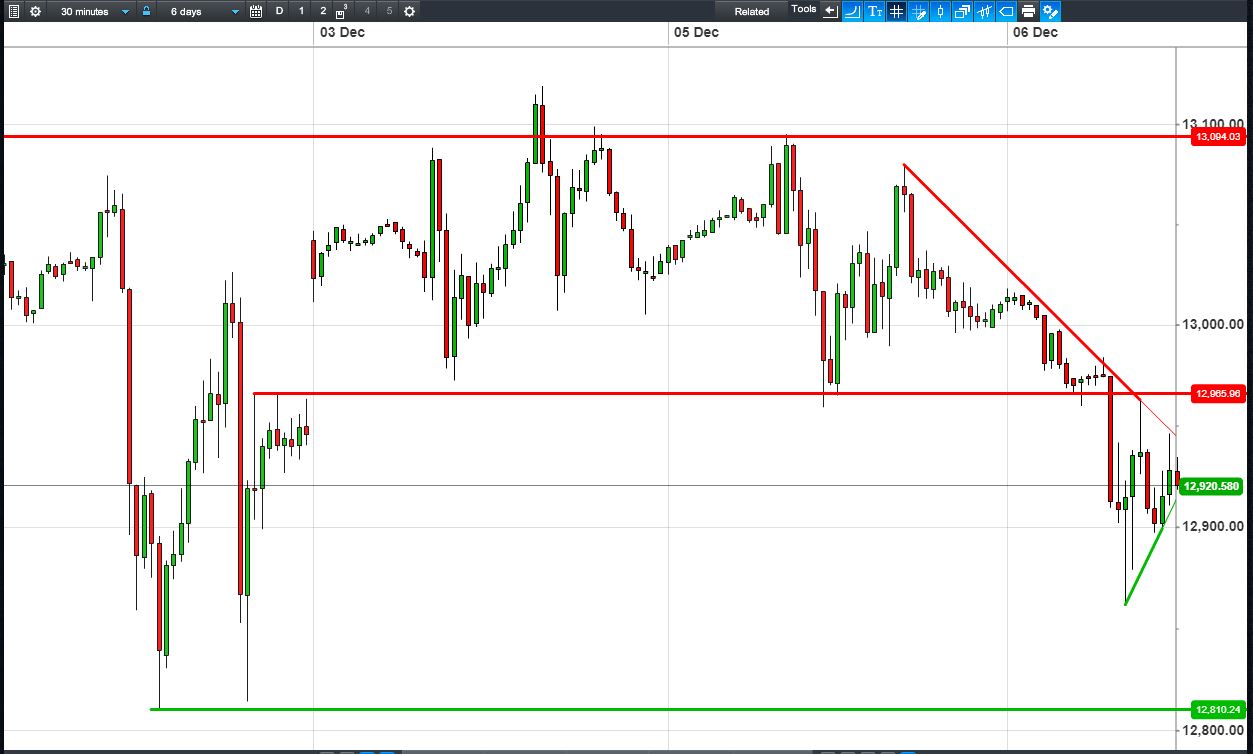 The DAX 30 is in a narrowing pattern at 12920, with a downward bias.