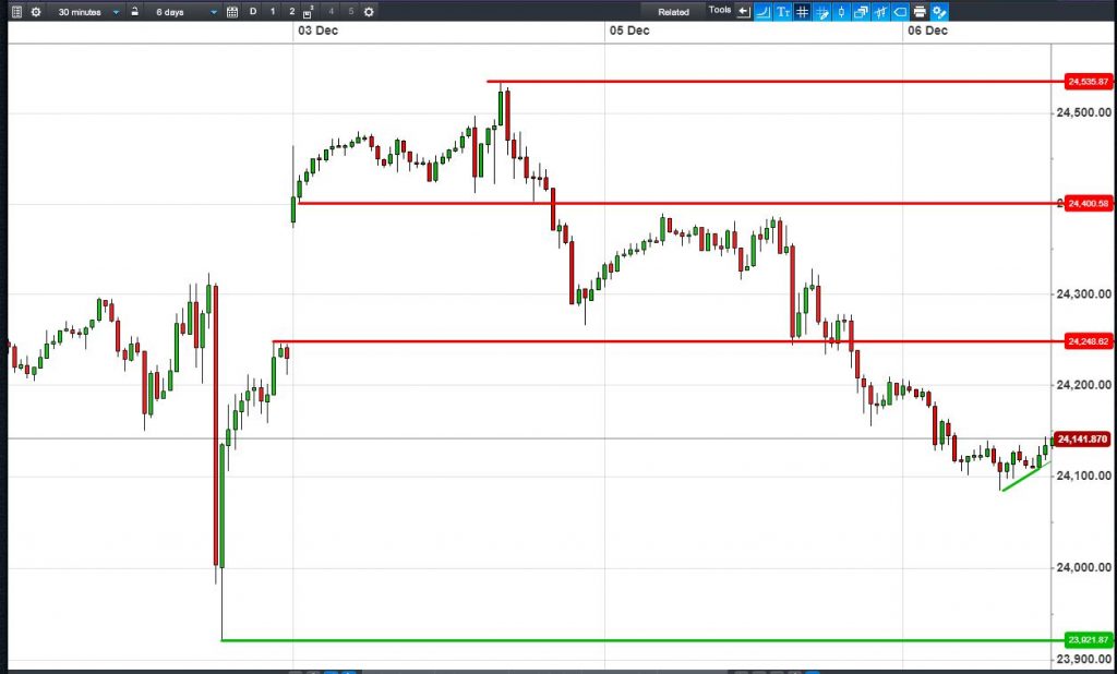 The UK Index 100 has recovered all its overnight losses. The DAX 30 is in a narrowing pattern at 12920, with a downward bias. Dow Jones Futures are off their lows, after bouncing from 24100. Gold is holding its $1260 bounce, but this could be yet another bearish flag lower.