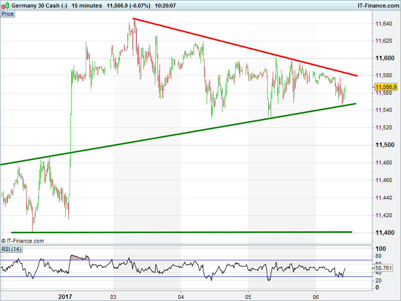 The DAX 30 is trading around 11560 within a narrowing range. Bullish consolidation via pennant or flag before another breakout?