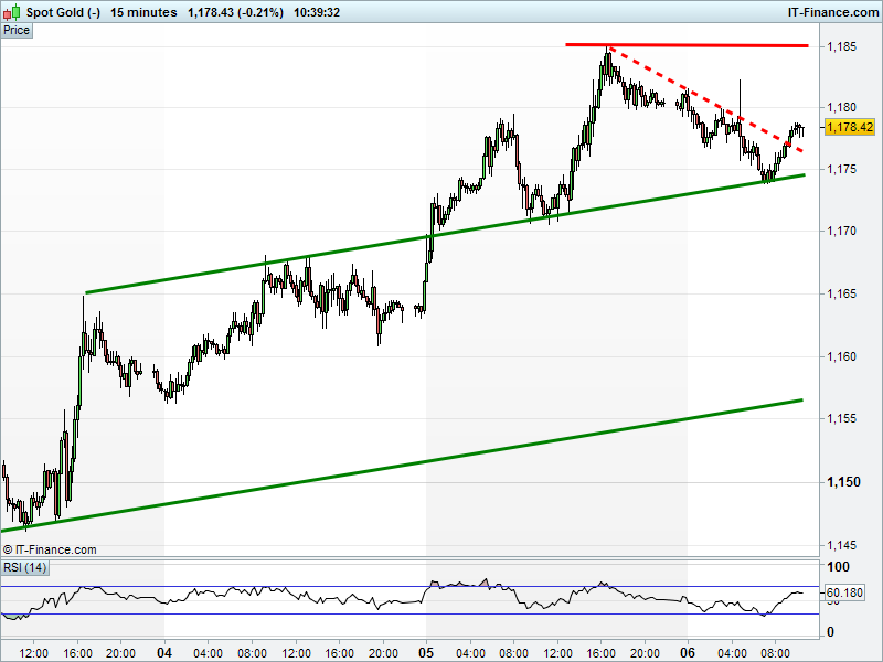The UK 100 remains in the middle of its 7180-7210 shallow rising channel. The DAX 30 is trading around 11560 within a narrowing range. Bullish consolidation before a breakout? Dow Jones Futures are still easing back from 19900, but could be forming a bullish flag back up towards 20,000. Gold has bounced off 2017 intersecting support at $1174 and overcome the overnight downtrend. Another leg higher helped by a USD under pressure?