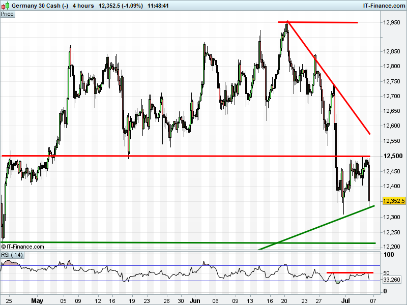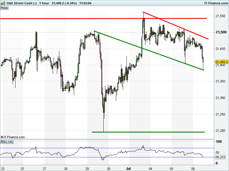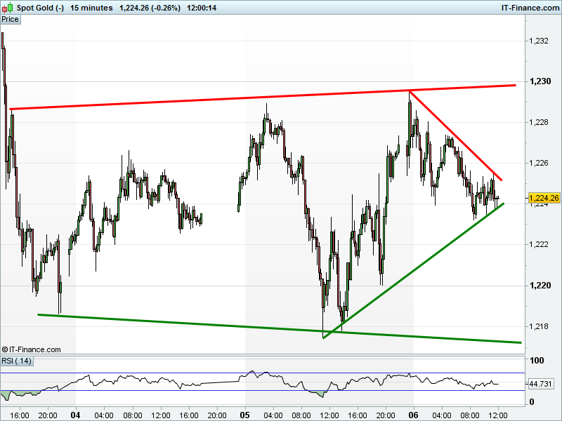 The UK Index 100 is trading back close to its recent bounce level at 7300. Support? The DAX 30 is back for another test of December rising support at 12340. Bounce or breach? Dow Jones Futures have dropped to test the floor of a new falling channel 21385-21480. Gold at $1224 is primed to break from a narrowing pattern, towards either $1218 or $1230.