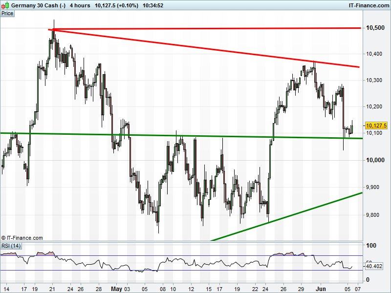 The DAX has rebounded from what looks to be resistance-turned-support at 10100. Still in longer-term narrowing pattern. Bounce back towards recent highs? EUR strength from USD weakness is not proving the usual hindrance.