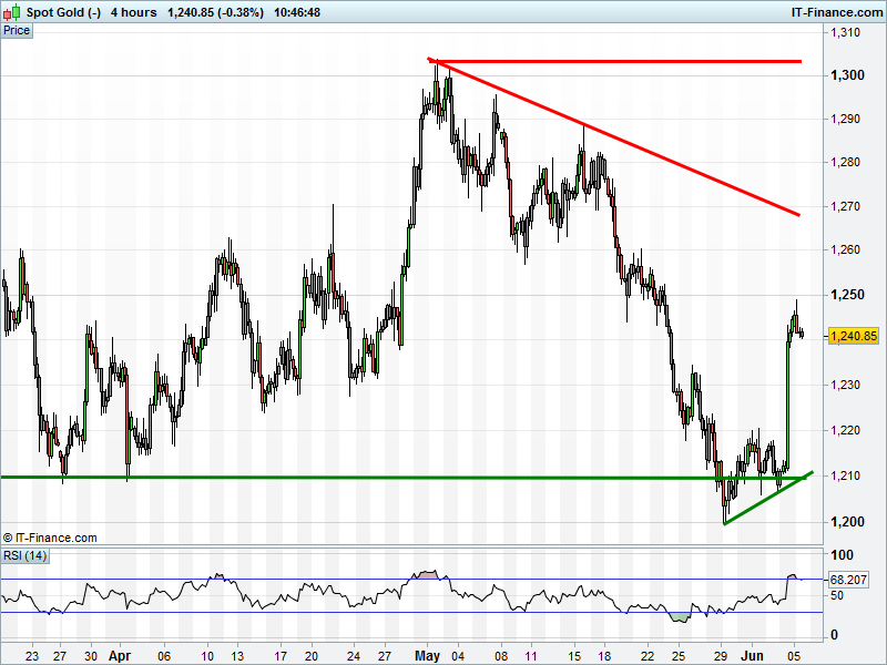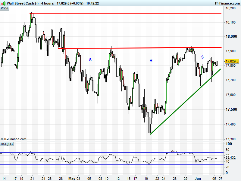 The UK 100 has broken above 6250 and is in the midst of a bullish pennant towards 6290 end-May highs. The DAX30 has rebounded from resistance-turned-support at 10100. Wall Street/Dow Jones futures have bounced off 17800 and could be forming a 6-week bullish inverse head & shoulders reversal back to 2016 highs. Gold is holding above $1240 after sharp US jobs report inspired gains of Friday.
