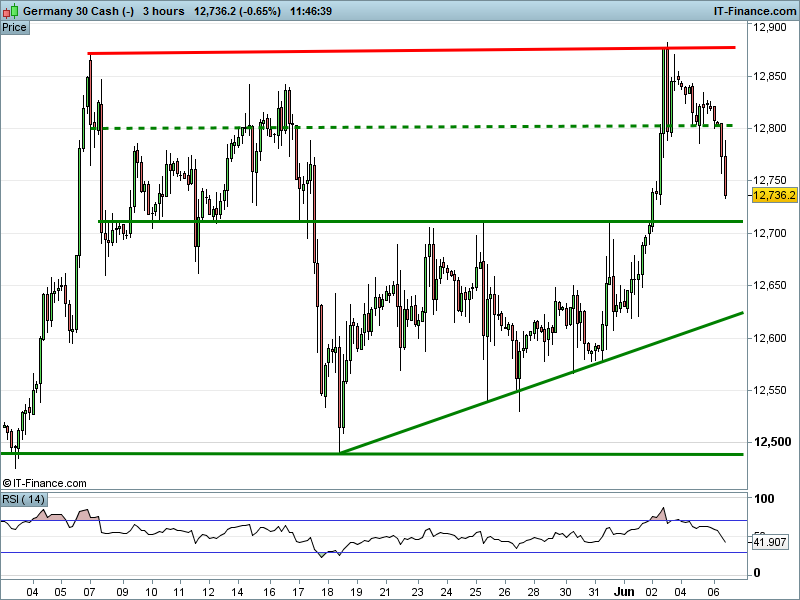 The DAX 30 has taken a leg lower after breaking 12,785 support, accelerating its fall from last week’s all time highs.
