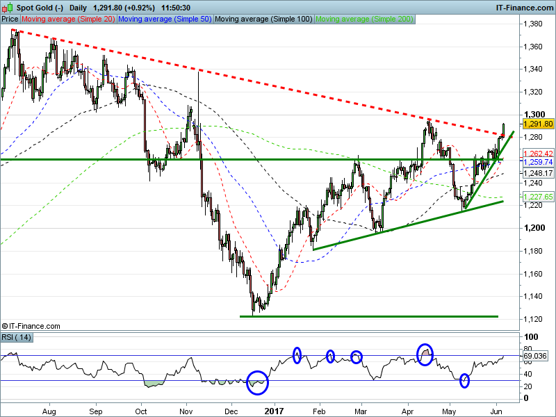 Gold has broken out from 11-month falling highs resistance of $1282. Note RSI approaching overbought.