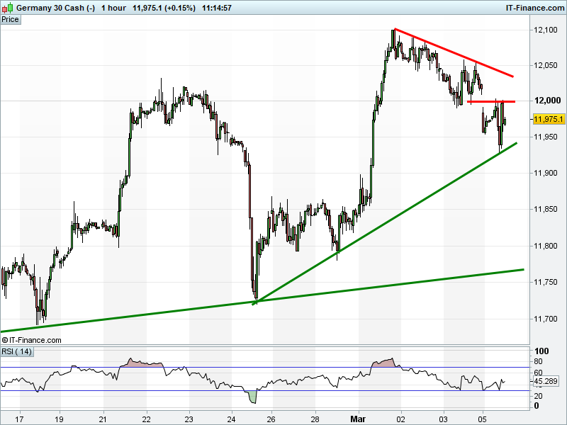 DAX 30 is trading between rising support at 11940 and 12000 resistance after this morning’s break-down. Will the correction or uptrend prevail?