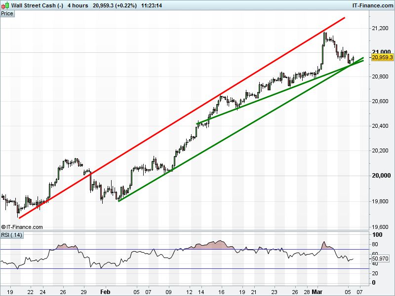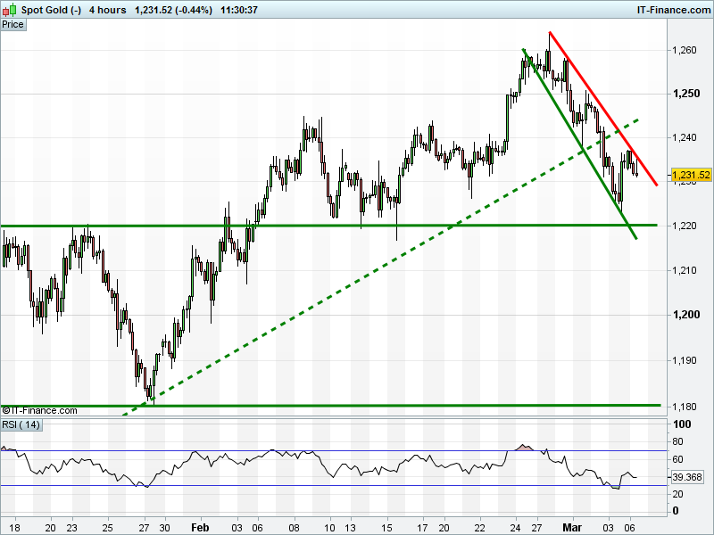 The UK Index 100 is holding its late-Feb uptrend thanks to triple support at 7340. The DAX 30 is trading between rising support at 11940 and 12000 resistance after this morning’s break-down. Dow Jones Futures have found support at 20900 to halt the correction. Gold remains under pressure since breaching its 2017 uptrend at $1240.
