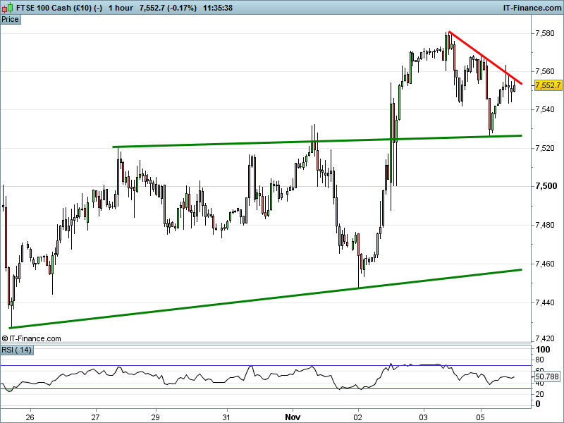 The UK Index 100 remains hindered by overnight falling highs at 7555.