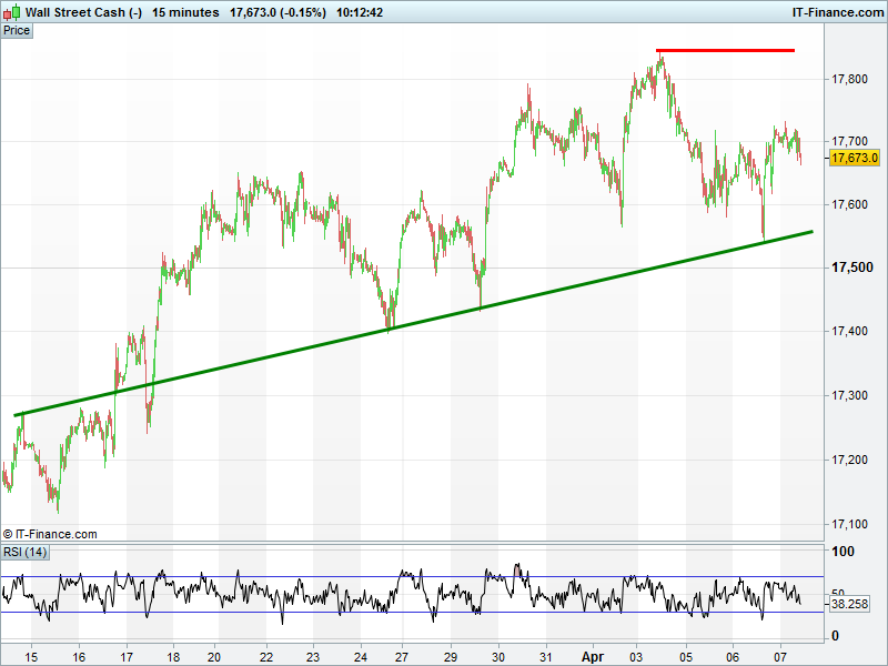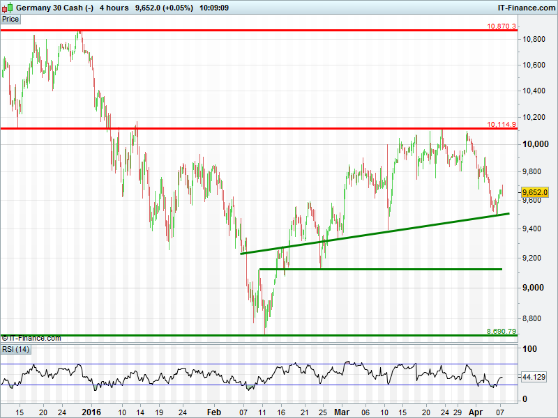 UK 100 tested 6200 channel highs again but a breakout still eludes. DAX30 bounced off support at 9500 to keep it in a shallow March uptrend . Wall Street/Dow bounced off 17550 support to maintain March rising trend. Gold registered a bullish breakout at $1230.
