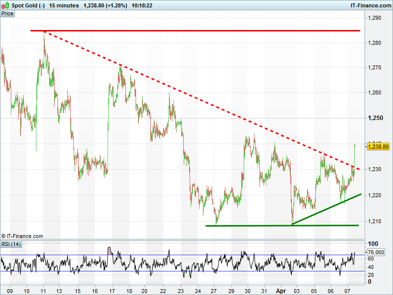 Gold has made a bullish breakout at $1230 which sees it get beyond a 1-month trend of falling highs resistance. Reversal to the cards? Weaker USD helping the dollar-denominated safehaven.