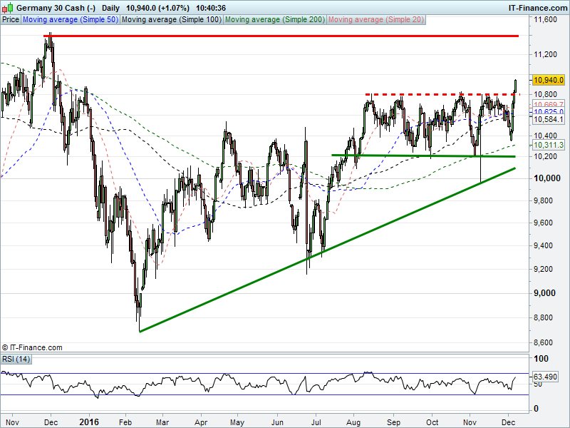 The DAX 30 has broken above 10800 to exit its 4-month sideways channel, trade near 12-month highs and allow bulls think about 11400 again.