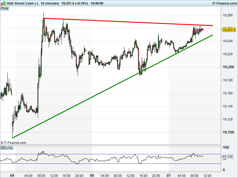 Dow Jones Futures are flat after yesterday’s gains, but trying to get back above 19250 for another test of Monday’s all-time highs. Falling highs resistance needs to be cleared first though.