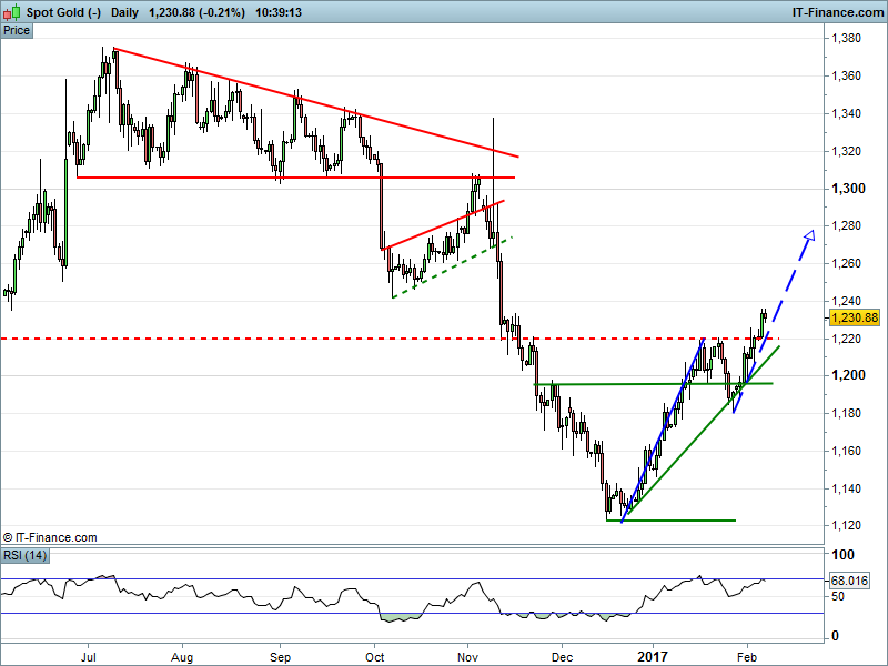 Gold is falling away slightly on account of dollar strength, however remains in uptrend as it looks to complete a bullish flag pattern to $1280.
