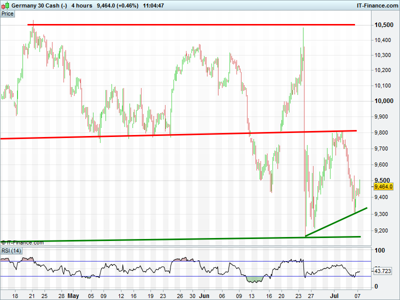 The DAX30 has found rising support and bounced 200pts to re-visit 9500.  Does the recovery have legs to 9800?