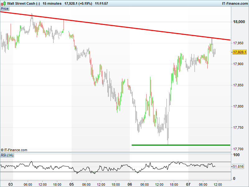Wall Street/Dow Jones futures have made it back to 2-week falling highs resistance at 17960, but have yet to make a test. Can they breakout to 18000 or better?