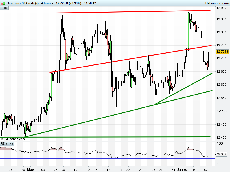 The DAX 30 has bounced off 12650 rising support but already found intersecting resistance at 12750.