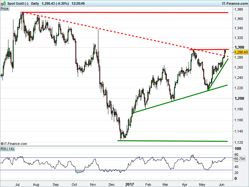 Gold has dropped back to $1290 after its bullish breakout struggled to overcome April’s $1296 highs.