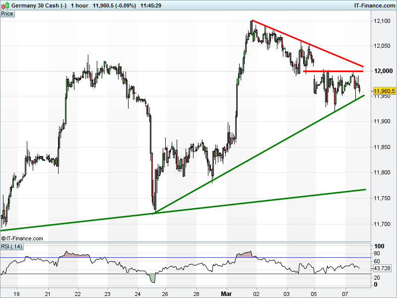 DAX 30 remains sideways, buoyed by rising support at 11950 following yesterday’s 12000 break-down.