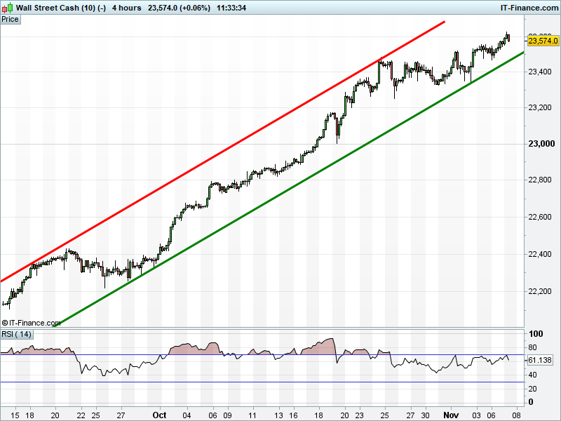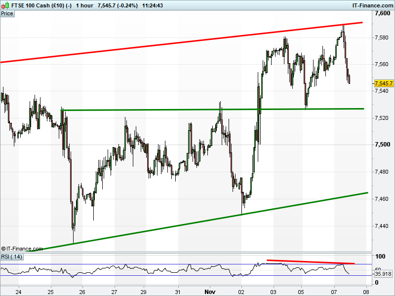The UK Index 100 has pulled back below 7545, but holds its uptrend. New sideways range?