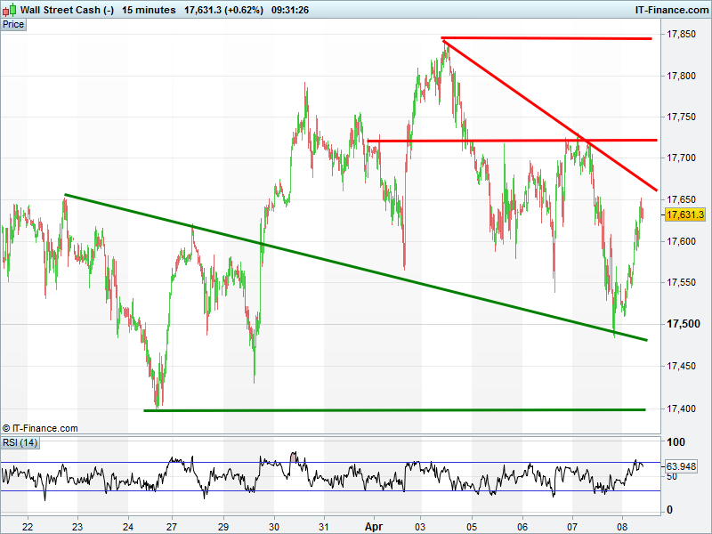 The Dow Jones has bounced 150ts pts 17650, but looks to be struggling under the weight of falling highs since hitting multi-month highs last week. Falling channel? Note RSI overbought.