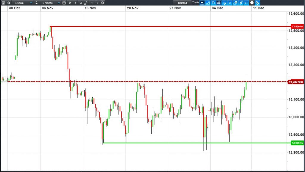 The DAX 30 is making an bullish test of late Nov 13200 highs.