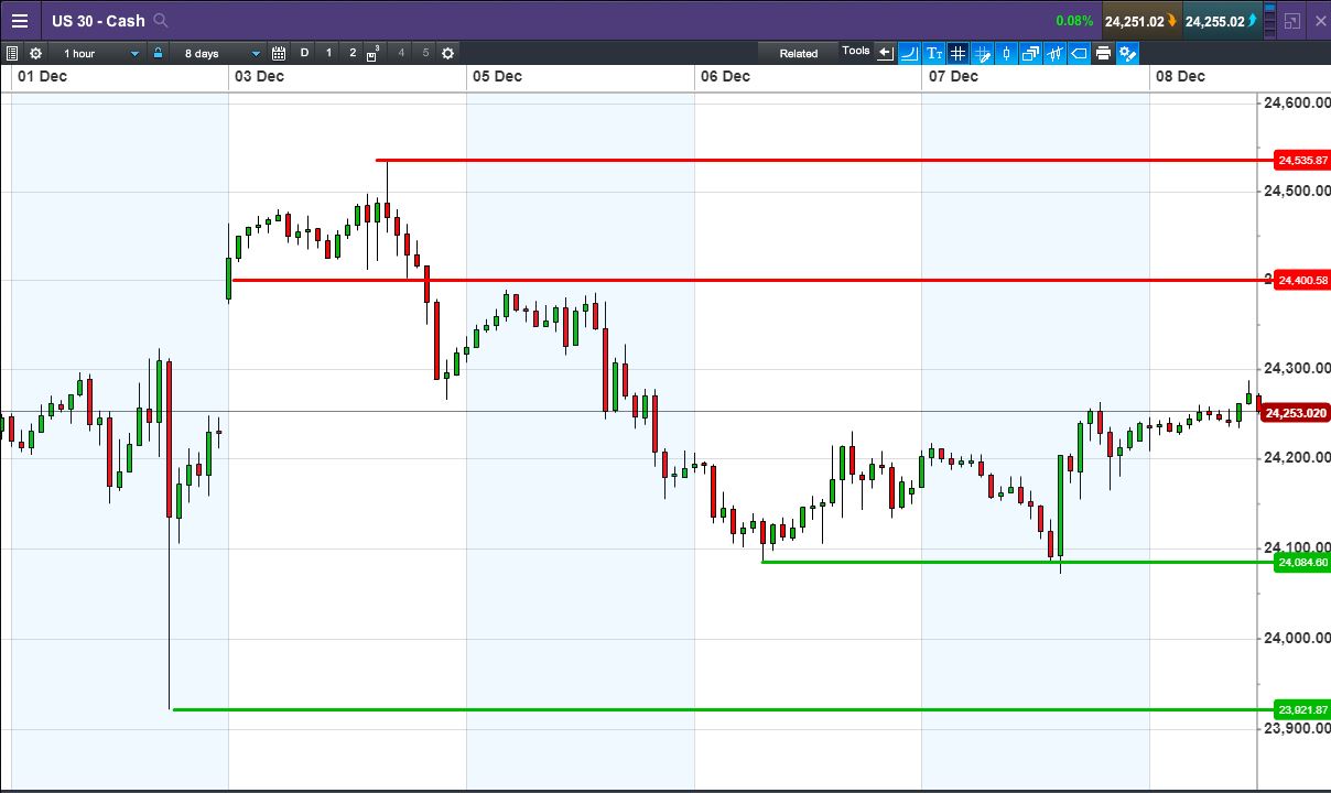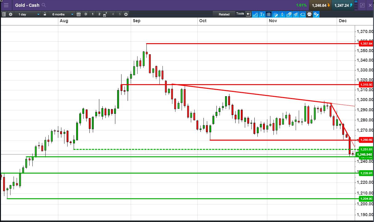 The UK Index 100 is holding its bounce at 7345. The DAX 30 is making an bullish test of late Nov 13200 highs. Dow Jones Futures are holding around last night’s 24250 highs. Gold has found support at late July low of $1245.