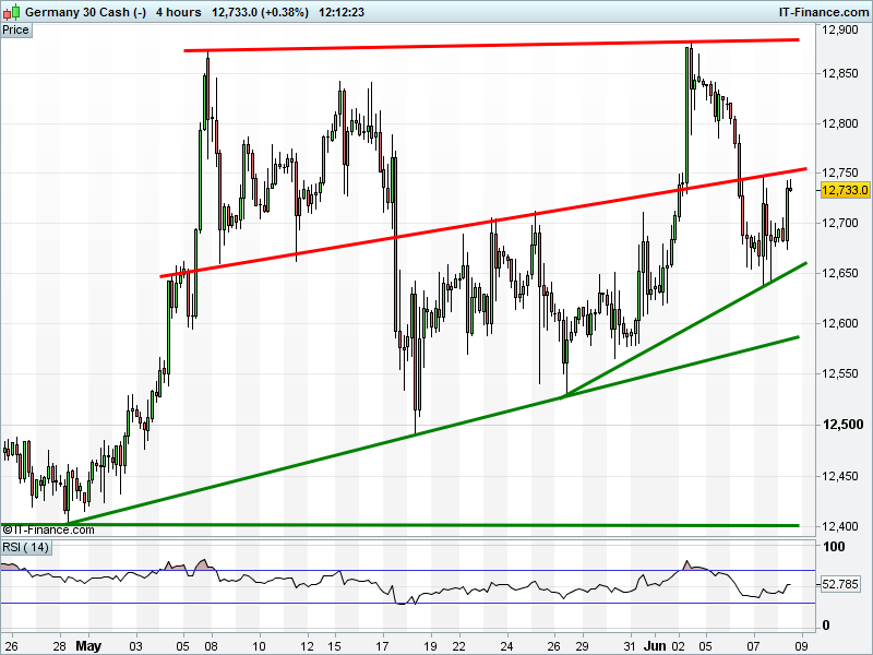 The DAX 30 continues to test 12750 1-month intersecting resistance.