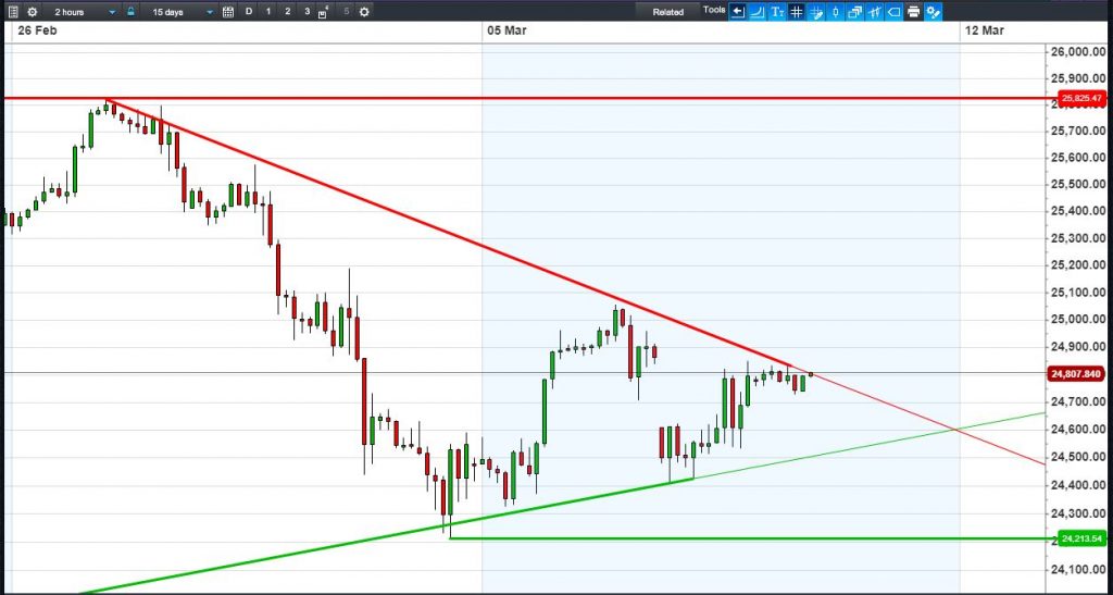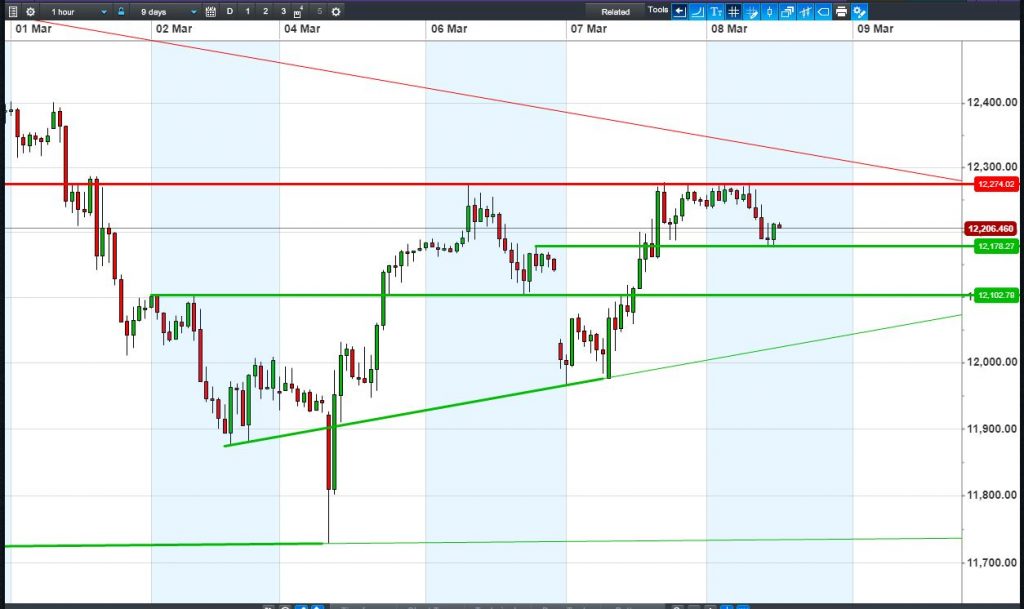 Equities trade mixed, off their best levels and still under pressure from falling highs resistance. This could yet see us re-test recent lows, even breach them, increasingly the likelihood of a second leg lower within a corrective phase that began late Jan. Panic may have eased about a trade war, the White House suggesting tariff exceptions for allies, however any bullish breath is being held until we’ve heard what the European Central Bank’s Draghi has to say on the outlook for growth and policy in his press conference at 1.30pm.