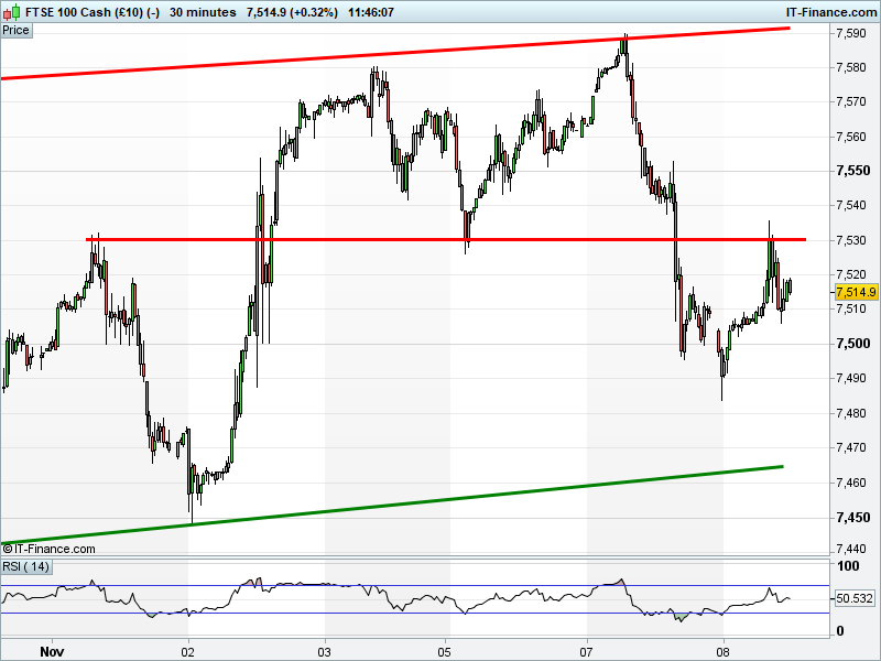 The UK Index 100 has pulled back from an early rally to 7,535.