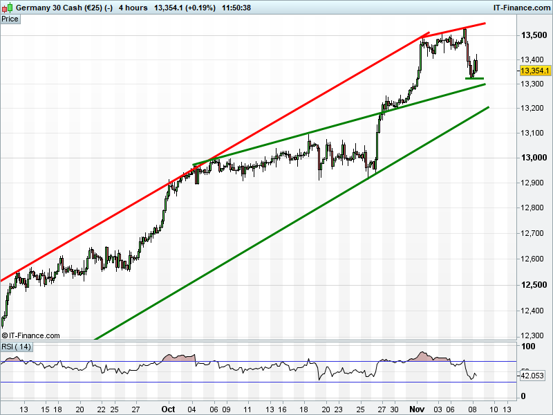 The DAX 30 holds the 13,350 mid-point of its 2.5-month up channel.