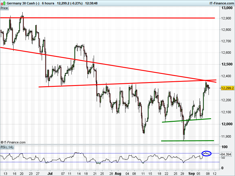 The DAX 30 has been checked by twin resistance at 122365. RSI overbought, Bulls hope this is merely a bullish flag after the recent rally, which will be followed by a breakout to 12400. Bears just want a retrace.