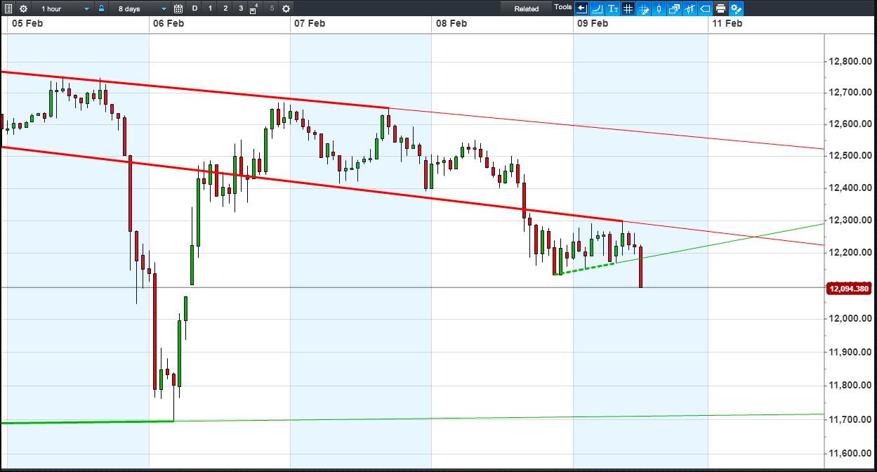 The DAX 30 has breached yesterday’s 12130 lows, pointing back south.
