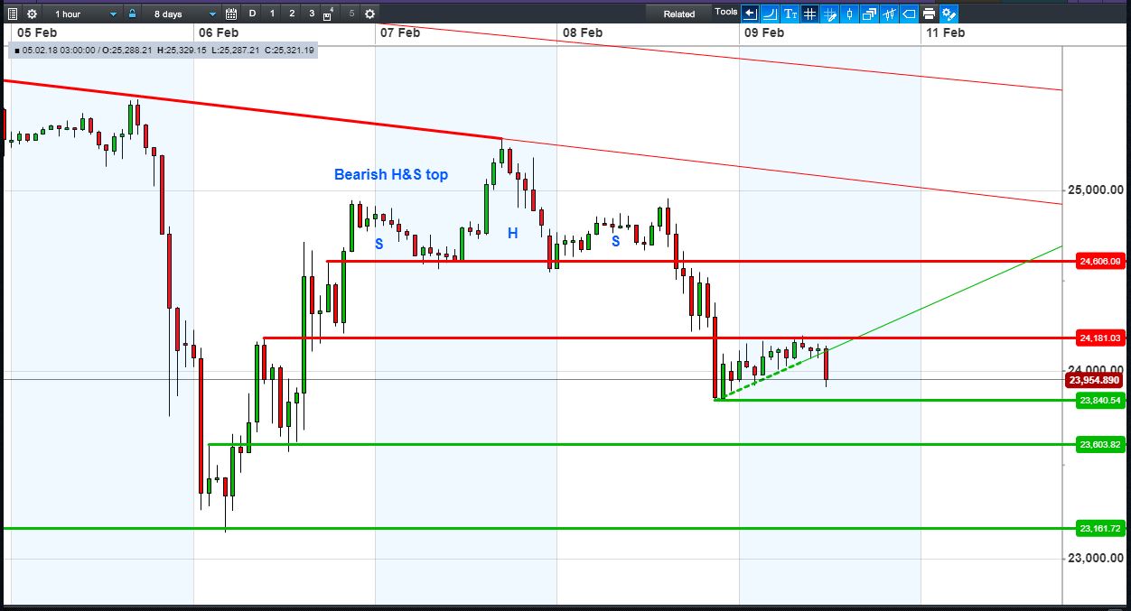 Equities are off their best levels and back under pressure. After an exciting week in terms of volatility, the bounce after the sell-off is looking more dead-cat than bullish-reversal, with major indices testing support levels and looking set to resume the downtrend that began late Jan, resulting in in stock market corrections which took many by surprise.
