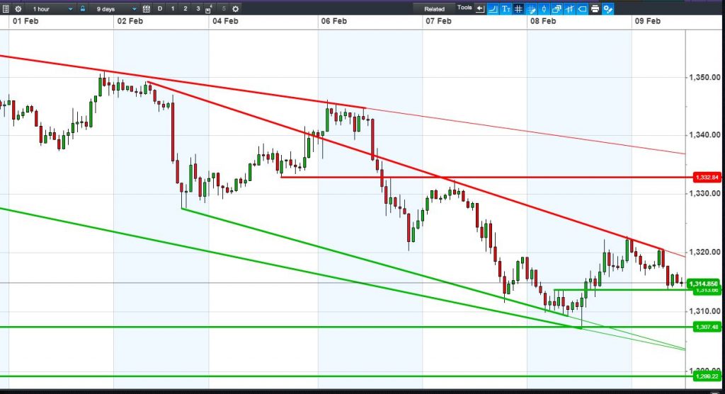 Gold’s is back at $1315 support, in a new narrower falling channel.