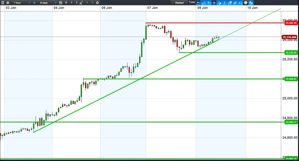 Dow Jones Futures have resumed their uptrend towards yesterday’s 25390 highs.
