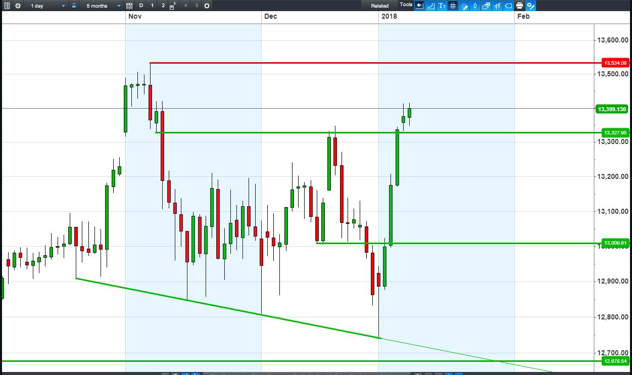 The DAX 30 is flat, holding yesterday’s 13300 breakout in a narrow 13330-13415 range.